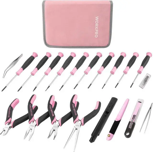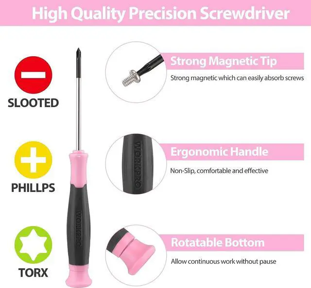 Multifunctional Pink Tool Set33PCS Precision Repair Tool Set contains precision screwdrivers set, pliers set, tweezers, craft knife with 5pcs blade, and utility knife with 10pcs blade. Precision repair kits can repair various electronic devices, such as computers, notebooks, iPhones, ps4, toys, glasses, lamps, small appliances, etc. For screen replacement, replacement of critical electronic components, cleaning, demolition, remodeling of building equipment, etc.