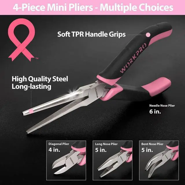 4PCS Precision Pliers SetThis mini pliers set includes 6" Needle Nose Plier, 4" Diagonal Plier, 5" Long Nose Plier, and 5" Bent Nose Plier. The 4-piece needle nose pliers set can help with delicate chores or repair electronics projects. The pliers are made of drop-forged carbon steel with nickel plating, the advantages of these pliers are better rust protection and stronger corrosion resistance.