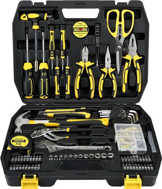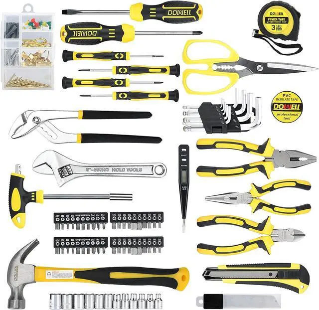 COMPLETE VARIETIES: A combination of a variety of basic tools, screwdrivers set, bits set, sockets set, pliers set, adjustable wrench, hammer, scissors, measuring tape, hex key set, utility knife, assorted screws kit, insulation tape, voltage tester pen. Limited tools with unlimited functionality.