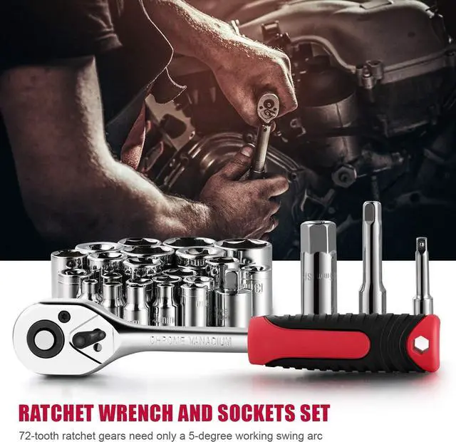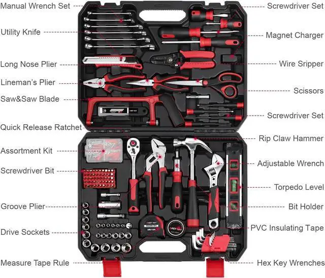 COMPREHENSIVE ASSORTMENT Tool kit includes professional-grade wrenches, torpedo level, a complete range of 1/4 inch and 3/8 inch metric-sized sockets and precision screwdrivers, hammer, tape measure, pliers etc. The 72-tooth ratchet easily shift to change direction by flick of 5-degree switch.
