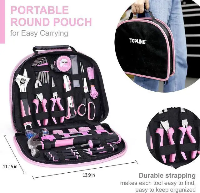 This 208-piece ladies pink tool set with easy carrying round pouch is an excellent choice for new apartment use. It is a small tool kit contains tools for most daily household use. This pink tool kit for women includes 12 OZ hammer, SAE long hex key, screwdriver bits, pliers set, adjustable wrench, snap-off knife and other various tools for diy projects, daily and work use.