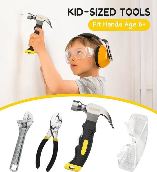 with real tools: small 8oz hammer, 6 wrench, 6" slip joint pliers, 9 level, 10ft measuring tape, 2pcs 2spring clamps, 2pcs screwdrivers, safety goggles and scissor etc.