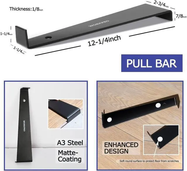 Enhanced Pull Bar: Made from premium A3 steel with matt coating, the pull bar designed with enhanced strength and corrosion resistance. The pull bar is 12-1/4 inch long and 1/8 inch thick, which is superior to the normal design. The soft pads on the back can well protect the floor from scratch.