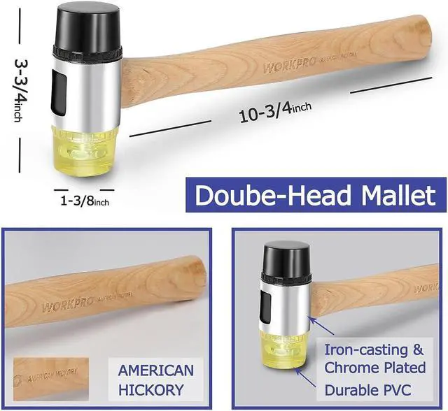 Reinforced Mallet: Constructed of cast iron with bright chrome plating, the hammer is equipped with the hardness of 90±5 HAS. The double-faced solid PVC head delivers a softened, positive strike. The mallet head is 1-3/8 inch in diameter. The handle is made of American hickory which is lightweight but tough. The whole mallet is 10-3/4 inch long and weighs 1.036 lb.