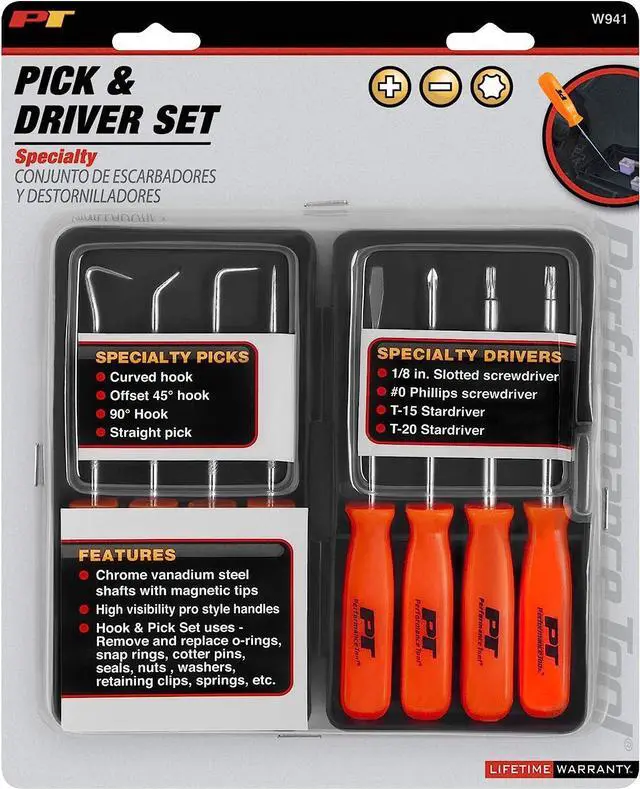 SPECIALTY PICK/DRIVER SET: The Performance Tool W941 set includes 8 precision picks and drivers that are ideal for intricate, detailed work.