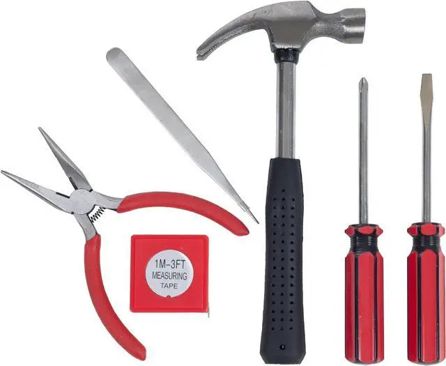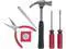 SET INCLUDES 6" Flathead Screwdriver, 6" Phillips Screwdriver, 4oz. Hammer, 5" Tweezers, 5" Long Nose Pliers, 3 ft Measuring Tape