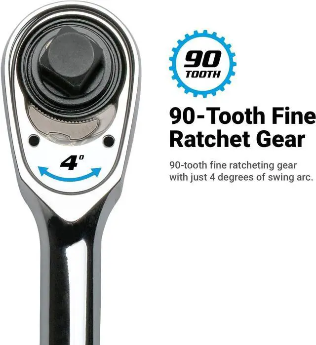 • 90-tooth fine gear ratchet with just 4 degrees swing arc is essential for working in narrow spots. True single-pawl gear design gives our ratchet an unparalleled smooth ratcheting mechanism