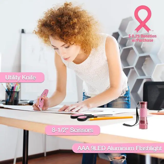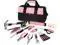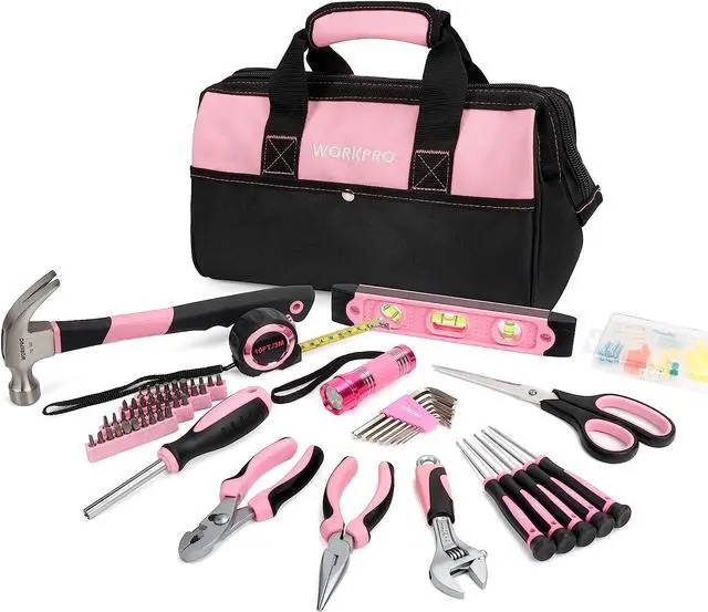 Pink Tool Kit- This tool set includes the most useful and necessary tools for home maintenance and daily use. Contents flashlight, hammer, level, auto lock tape measure, pliers, screwdrivers and Cr-v bits, wrenches, scissor, utility knife and SK5 blades, hex keys, and hardware kit