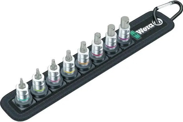 8-Piece bit socket Set on a robust textile belt, ¼" In-hex sockets with all the advantages of the Wera bit technology In-hex sockets with holding function for screws/bolts Country of origin: Germany