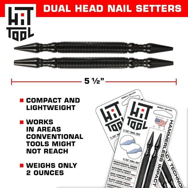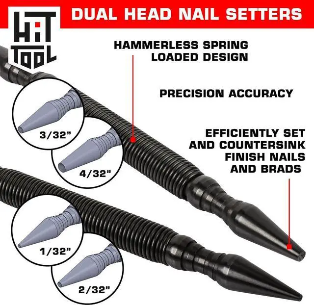 HIT Tool Pro Finish Kit: This professional grade kit contains two 2-in-1 nail setters. The first dual tipped tool has a 1/32" Nail Setter on one end and a 2/32" Nail Setter on the other. The second tool has a 3/32" Nail Setter on one end and a 4/32" Nail Setter on the other.