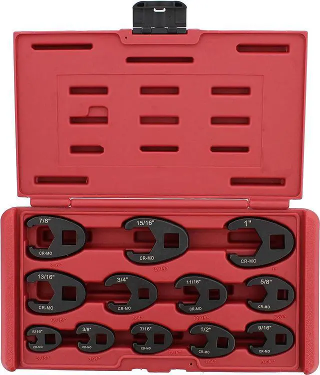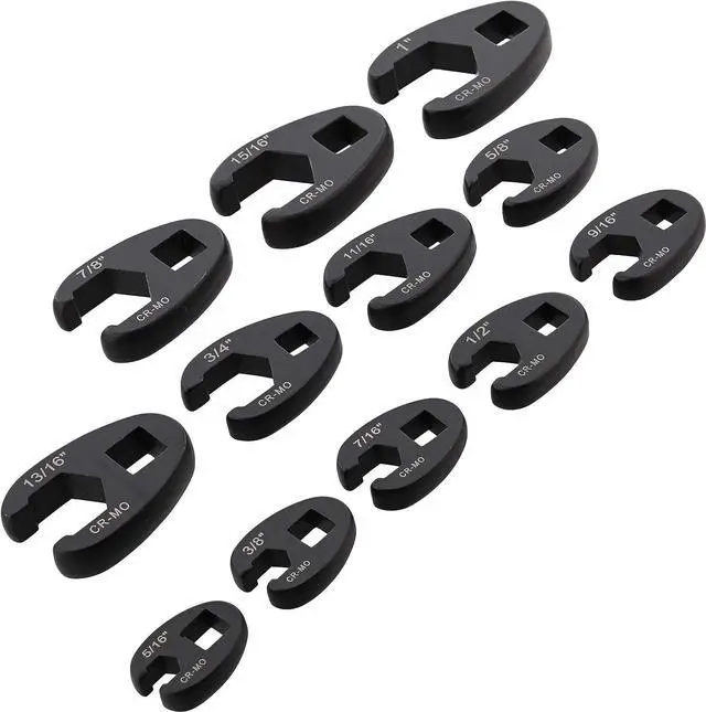 PACKAGE CONTENTS: Set includes (12) crowfoot wrenches 3/8-inch drive 5/16", 3/8", 7/16", 1/2", 9/16", 5/8", 11/16", 3/4 inch; 1/2-inch drive 13/16", 7/8", 15/16", 1 inch; Packed inside (1) storage case for your convenience