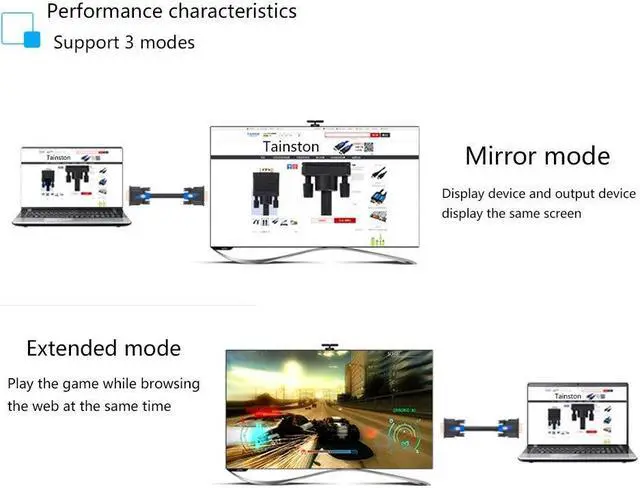 Supports resolutions at 800x600 (SVGA), 1024x768 (XGA), 1600x1200 (UXGA), 1080p (Full HD), 1920x1200 (WUXGA). Compatible HDTVS, Computer Monitors, and Laptop Devices.