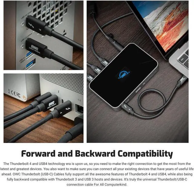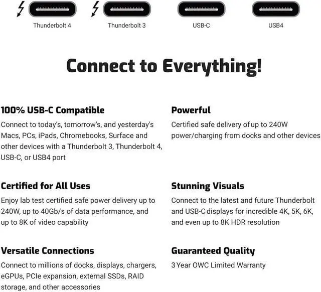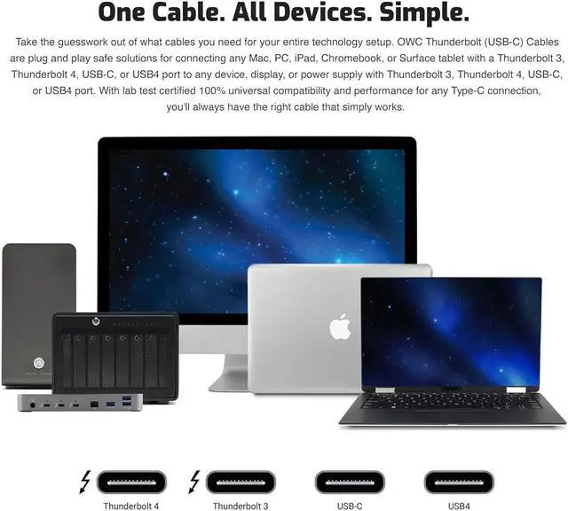 100% USB-C COMPATIBLE: The OWC Thunderbolt 4 Cable fully supports all the awesome features of Thunderbolt 4 and USB 4, while also being fully backward compatible with Thunderbolt 3 and USB 3 hosts and devices. A plug and play safe solution compatible with any Mac, PC, iPad, Chromebook, Surface tablet or any other device, display, or power supply with Thunderbolt 3, Thunderbolt 4, USB-C, or USB 4 port