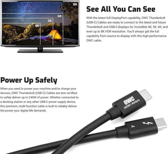 CERTIFIED FOR ALL USES: enjoy lab test certified safe power delivery up to 240W of power/charging for docks, adapters, and other devices, up to 40Gb/s of data performance, and up to 8K of video capability. The OWC Thunderbolt 4 and USB 4 cable is Thunderbolt certified to ensure 240W 20V/5A Power Delivery, 40Gbps data transfer speeds, and support for two 4K screens or one 8K screen
