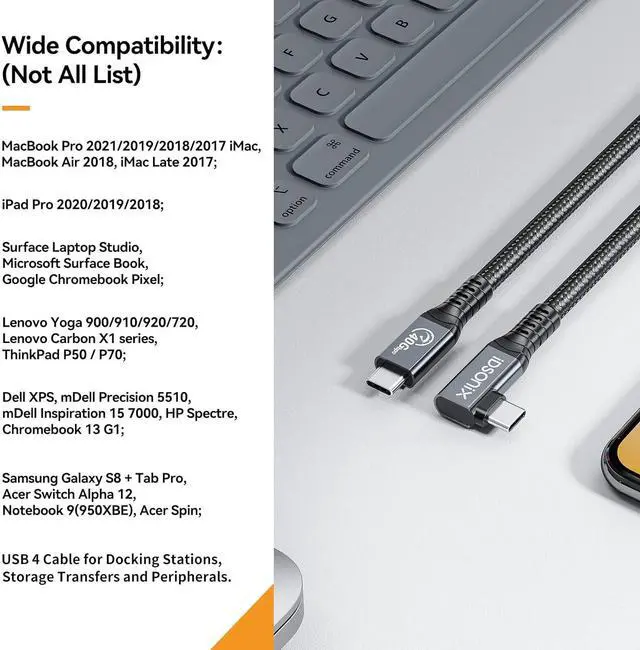 Wide CompatibilityUSB 4 cable is compatible with all Thunderbolt 4 & 3 devices and also backward compatible with USB4, USB 2.0 / 3.0, 3.1 Gen 1, and 3.1 Gen 2, it is perfectly for iPad Pro 2020/2019/2018, MacBook Pro 2020 16' ', Samsung Galaxy S8, Galaxy S8 +, Google Pixel, ChromeBook and more.
