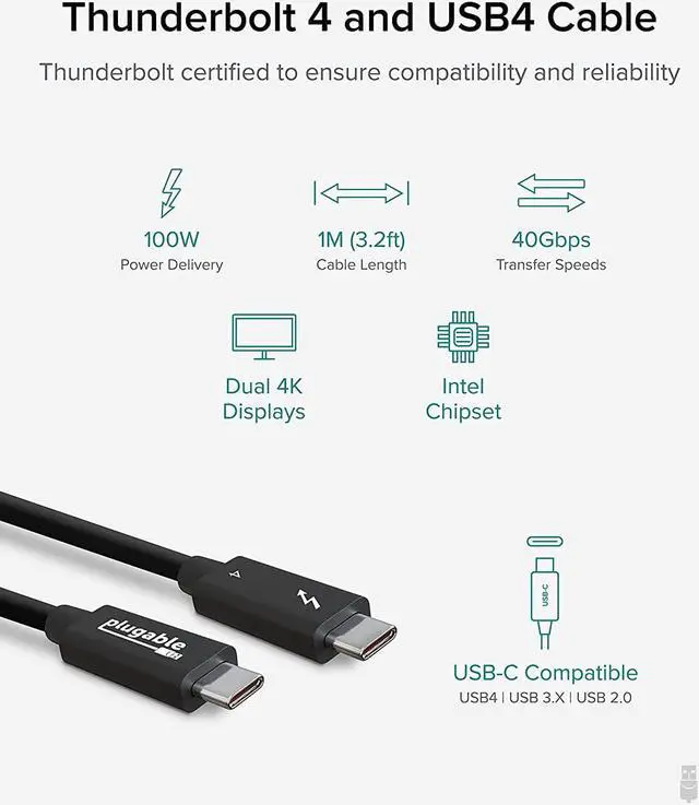 Certified Reliability - The Plugable 1M ( 3.3 ft) Thunderbolt 4 and USB4 cable is Thunderbolt certified to ensure 100W 20V/5A Power Delivery, 40Gbps data transfer speeds, and support for two 4K screens or one 8K screen