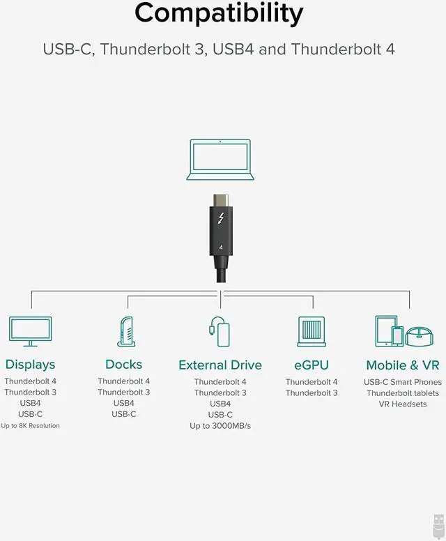 Compatibility - Because this is a Certified Thunderbolt 4 cable, its also fully compatible with Thunderbolt 3, USB4, USB C, USB 3. x/2. x/1. x. Thats one heck of a versatile Thunderbolt cable