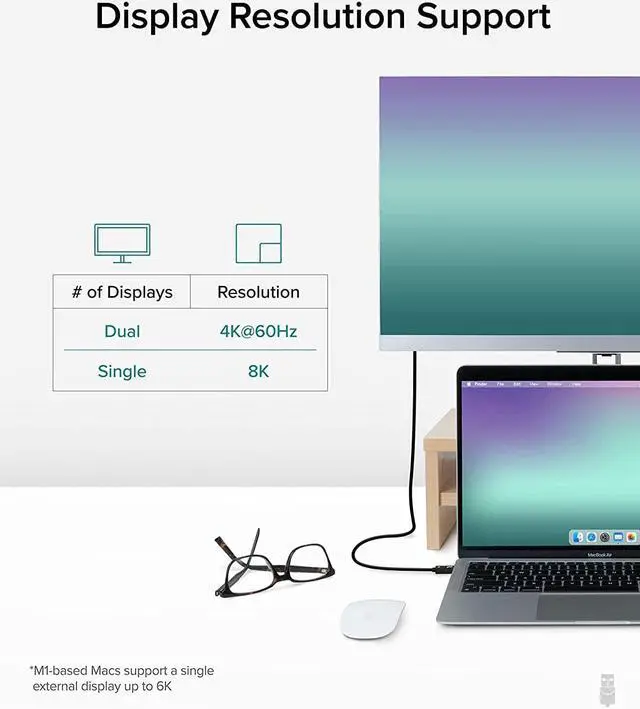 Display and Resolution Support - See the whole picture with support for dual 4K screens at 60Hz, or one 8K screen at 30Hz when paired with an appropriate hub or docking station. It' s worth noting M1 Macbooks only support a single external display
