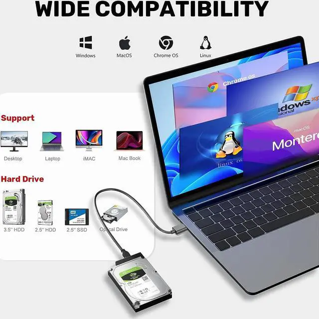 SATA to USB Adapter: Connect to the SATA device using USB interface. No drivers needed for you to enjoy its outstanding performance. Support Windows 7/8/10/MAC OS 8 or above.