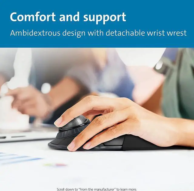 Ambidextrous design works equally well for right-handed and left-handed users. Trackball reduces wrist and hand movement to ease repetitive-stress injuries