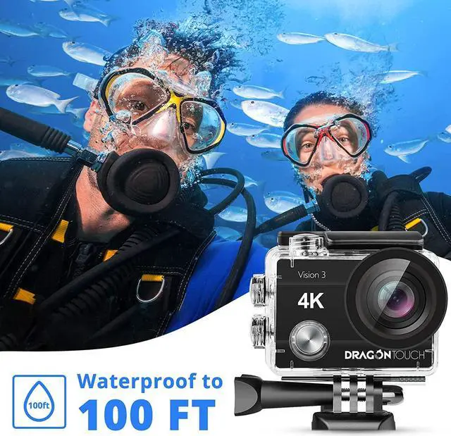 100FT Waterproof Action Camera: Place your camera into the waterproof case and securely fasten it, you can dive below 100ft (30m). Underwater cameras is ideal for water sports such as swimming, surfing, diving, snorkeling etc.