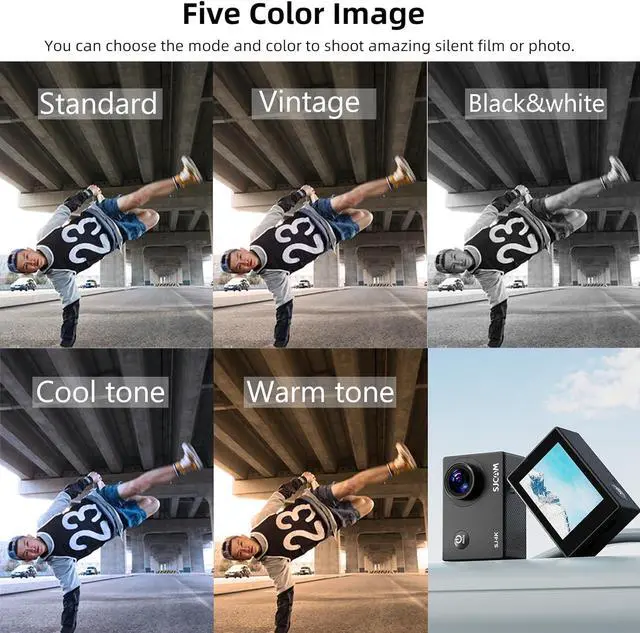 ACTION CAMERA FOR FILM: SJCAM 4K ACTION CAMERA Including loop recording, slow motion photography, Car mode, image flipping, time-lapse photo, exposure adjustment, white balance adjustment etc. There are 5 video/photo colors available (normal, black and white, retro, warm, cool), you can choose the mode and color to shoot amazing silent film or photo.