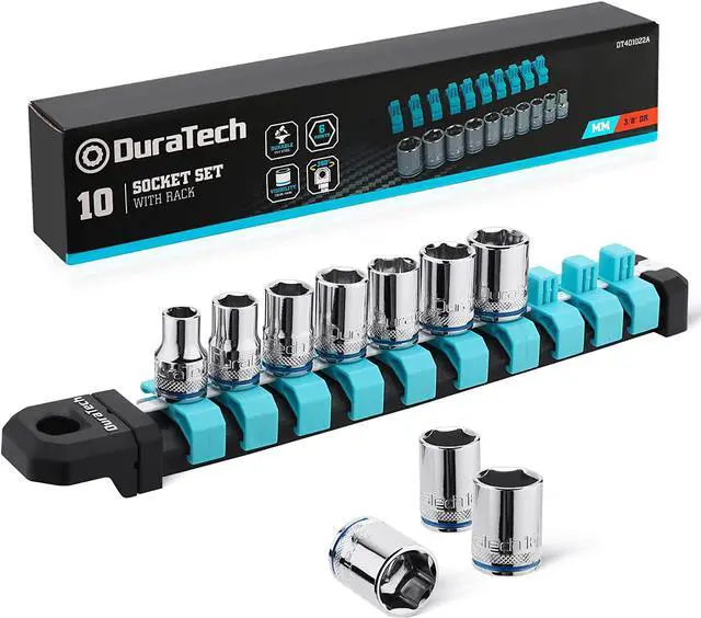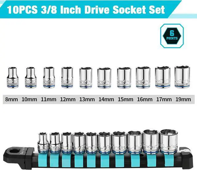 WHAT YOU GET: This 10PCS metric socket set including 8mm, 10mm, 11mm, 12mm, 13mm, 14mm, 15mm, 16mm, 17mm, 19mm 3/8 inch 6-Point shallow sockets and a storage plastic rail.