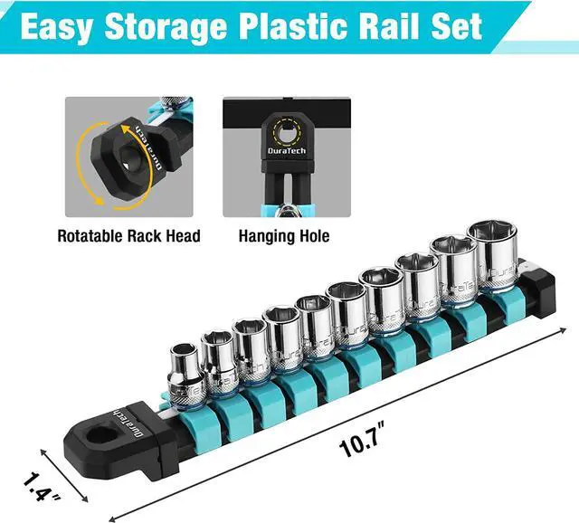 CONVENIENT TO USE: These sockets are storage on the firm plastic rail with 360 degrees rotating head and hanging hole for organization and storage. Just remove the white plastic strip securing the socket set, then press the blue plastic clip and pull out the socket to use.