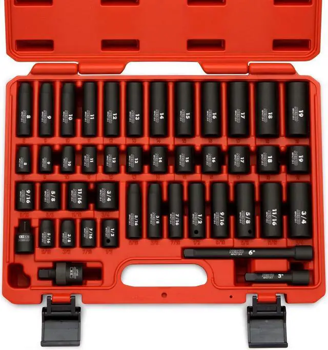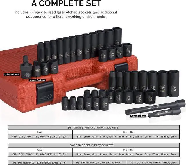 HEAVY-DUTY IMPACT SOCKETS: Each socket in this 44-piece master kit is constructed with high-impact drop-forged premium CrV steel. The sturdy and professional chrome vanadium construction allows you to take on any project, large or small.