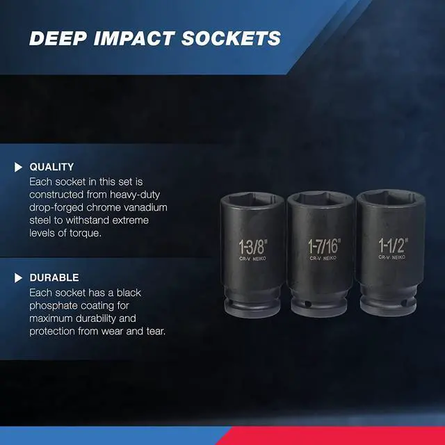 INCLUDES COMMON SAE SIZES: Includes eight common Standard socket sizes (1, 1-1/16, 1-1/8, 1-1/4, 1-5/16, 1-3/8, 1-7/16, 1-1/2 inch) with blow-mold storage case included.