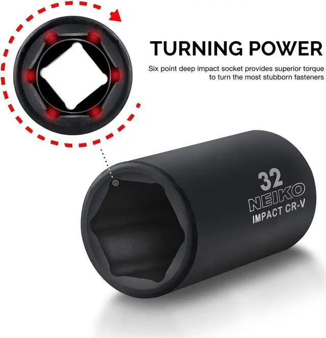 6 POINT SOCKET: The 6-Point hex socket design prevents round-off on nuts and bolts under high torque exertion and hammering stress from the use of an impact wrench or electric wrench with a strong output.
