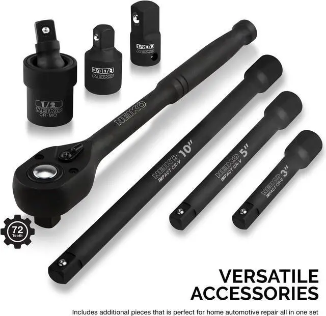 1/2-inch drive extension bars: 3, 5, 10-inch, (1) 1/2-inch drive 10-inch quick-release ratchet handle, (1) 1/2-inch drive impact universal joint, (1) 1/2 to 3/8-inch drive impact reducer, (1) 3/8 to 1/2-inch drive impact adapter.