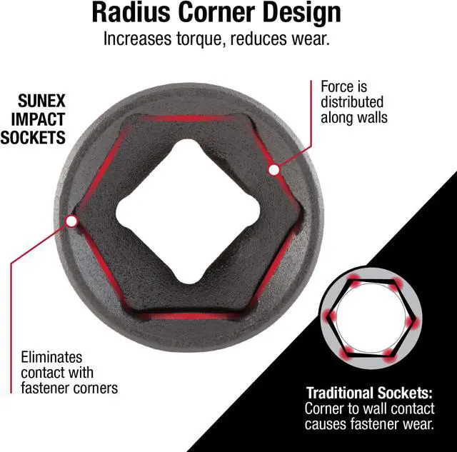 RADIUS CORNER DESIGN: Reduces wear and increases torque on fasteners by placing force on fastener walls rather than fastener corners.