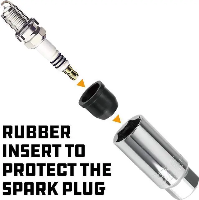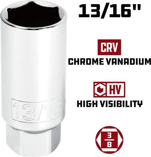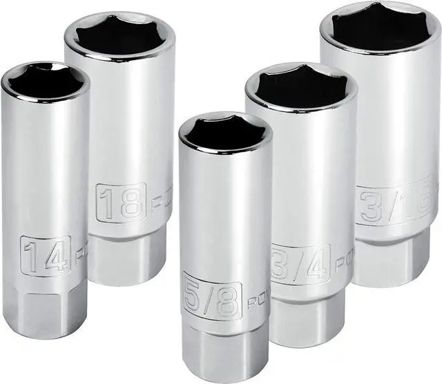 Sockets include 5/8-Inch, 3/4-Inch, 13/16-Inch, 14mm, 18mm 6 point deep well thin wall mirror polished chrome vanadium socket with dual grease rings Rubber retaining ring holds plug securely Meets or exceeds ANSI standards Lifetime warranty