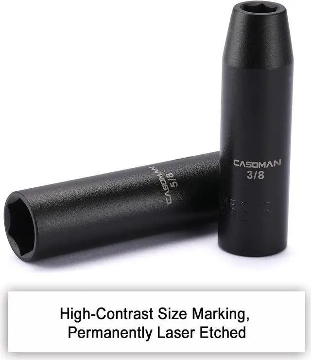 Permanent high visibility laser etched size marking on each socket for quick size selection when working.