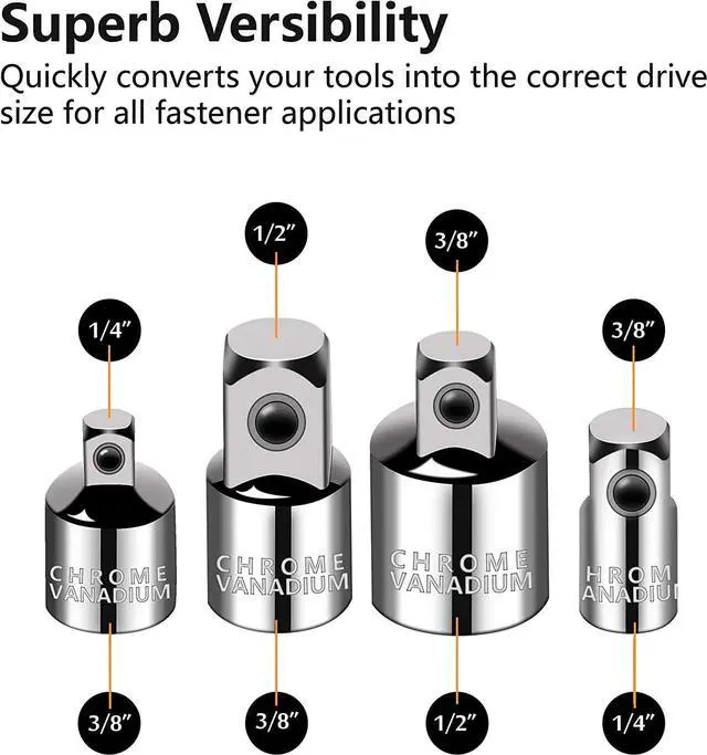 SUPERIOR VERSATILITY: Abundant variety of sizes make repairs easy on any car, bike or motorcycle, perform industrial work for machinery, remove a vehicles axle bolt, fix brakes, or even tune up wheelchairs. 4pcs impact adapters included are designed for impact driver conversion
