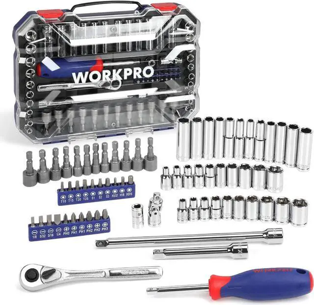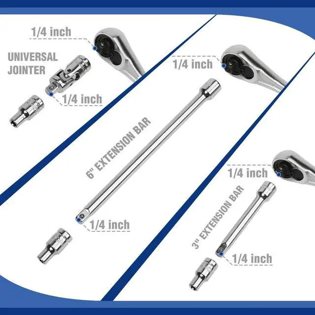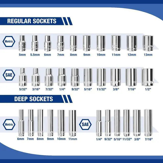 Set includes: 20-piece 1/4 inch drive regular sockets of SAE & Metric size (5/32' ', 3/16' ', 7/32' ', 1/4' ', 9/32' ', 5/16' ', 11/32' ', 3/8' ', 7/16' ', 1/2' ' &5, 5.5, 6, 7, 8, 9, 10, 11, 12, 13 mm); 12-piece 1/4 inch drive deep sockets of SAE & Metric size (1/4' ', 9/32' ', 5/16' ', 11/32' ', 3/8' ', 7/16' ' & 6, 7, 8, 9, 10, 11mm); 12-piece nut bits of SAE & Metric size (1/4' ', 9/32' ', 5/16' ', 11/32' ', 3/8' ', 7/16' ' & 6, 7, 8, 9, 10, 11mm); 1-piece reversible ratchet of 1/4' '; 1-piece spinner handle of 1/4' ', 1-piece 1/4' ' universal jointer; 1-piece 1/4' ' drive extension bar of 3 inch; 1-piece 1/4' ' drive extension bar of 6 inch; 1-piece 1/4' ' bit holder; 20-piece screwdriver bits.