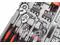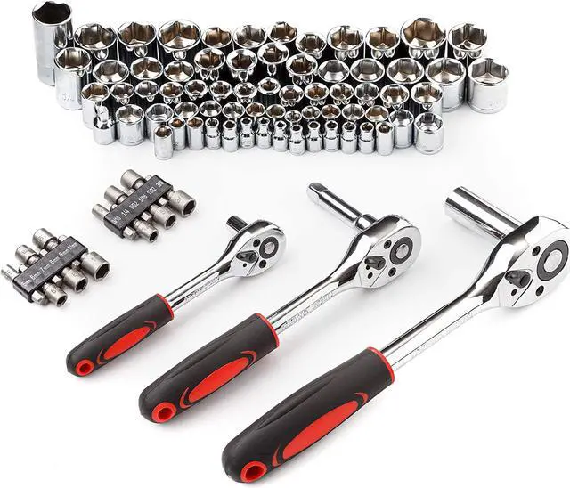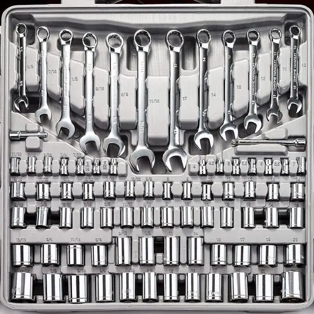 Comprehensive assortment of professional-grade wrenches, ratchets, a complete range of 1/4 inch and 3/8inch metric-sized sockets and precision screwdriver, hammer, pliers, wrench, and etc.