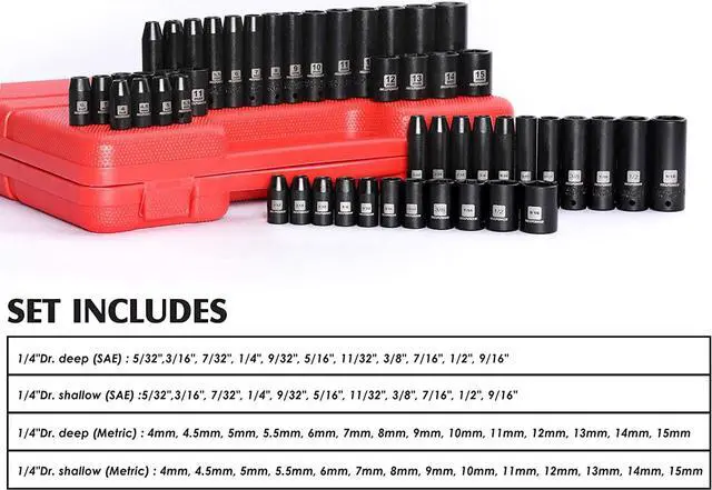 Dr. deep/shallow (SAE): 5/32", 3/16", 7/32", 1/4", 9/32", 5/16", 11/32", 3/8", 7/16", 1/2", 9/16" and 1/4"
