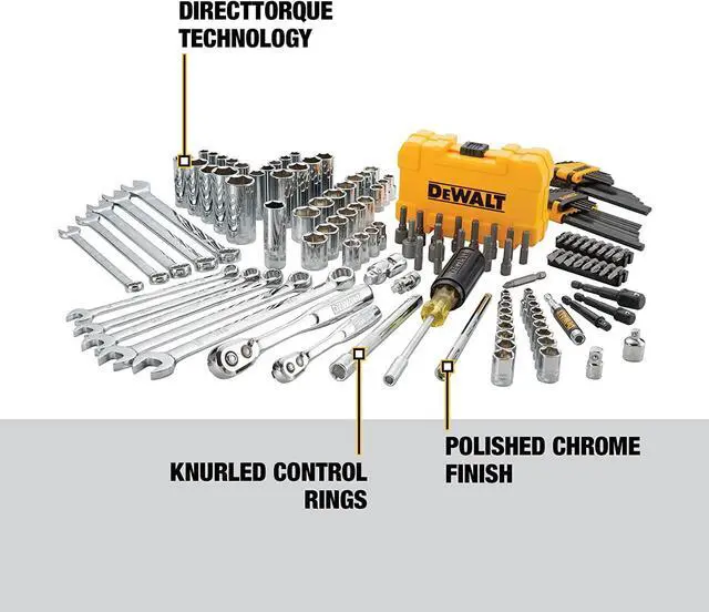 INCLUDES (2) Pear Head Ratchets, (18) 1/4" Drive Sockets, (10) 1/4" Drive Deep Sockets, (2) Extensions, (2) Universal Joints, (20) 3/8" Drive Sockets, (9) 3/8" Drive Deep Sockets, (10) Combination Wrenches, (2) Adaptors, (1) Spark Plug Socket, (14) Standard Hex Key Set, (14) Metric Hex Key Set, (1) Vinyl Grip Multi Driver, (15) Nut Driver Bits, and (22) Speciality Bits