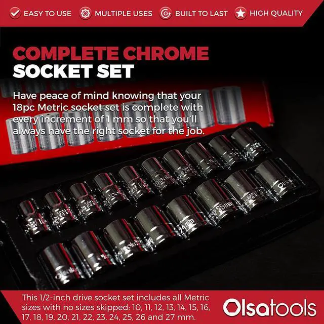 18PC COMPLETE METRIC SET - This 1/2-inch drive shallow chrome socket set includes every metric size from 10 mm to 27 mm with no sizes skipped!