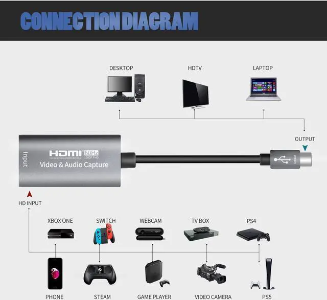 Operating Systems and various software: Windows 7/ 8/ 10, Mac OS X 10.9 or above, Linux, Android, Laptop, 3DS, Xbox One, PS3/PS4/PS5, Camera, Webcame, DSLR, Switch, TV BOX, HDTV, Potplayer/VLC, OBS Studio etc. Easily streams to Facebook/ Youtube/ Twitch