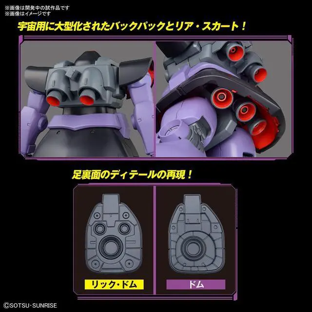 The armor and internal structures of MG 1/100 RICK DOM have been upgraded. Body structures such as the soles and backpack have been renewed, and the bluish-purple parts colors on the body of MG 1/100 DOM have been changed to recreate the Rick Doms refined color scheme.
