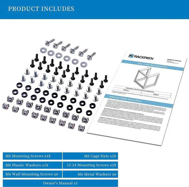 Contents: 9U Wall mount rack x1, M6 wood mounting screws & washers x6, M6 screws & cage nuts x18, 12-24 screws x18