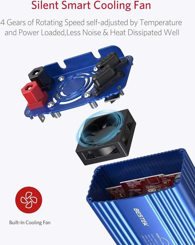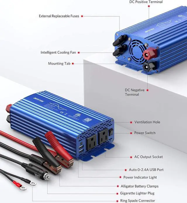 What You Get: 1xBESTEK 500W Pure Sine Inverter, 1xUser Manual, 2xbattery clamps cable, 1x 12V cigarette Lighter plug cable, 2 x spare fuses.