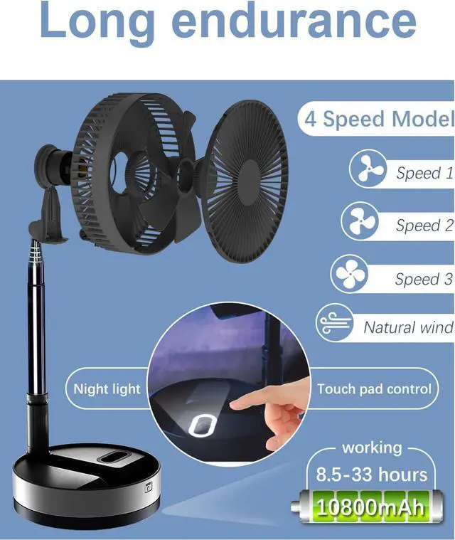PORTABLE : Folded Height 4.7X8.1 inches and weighing 2.97lb. Adjustable Height from 16 inch to 41 inch , from small table fan to Air-Circulator floor fan,but still portable for home and office, laptop, gym workout, car backseat, outdoors, camping, trips and anywhere need cool windUNIQUE DESIGN: Original, fashionable,quite, powerful, portable, safe both USB type-c and battery poweredMULT FESTURES : Multiple styles as desk fan,table fan,Pedestal Fan,flool Fan,USB fan,Personal fan Air Circulator(120 Degree rotate around ) with timer night light and remote control.