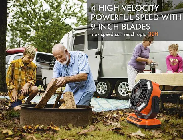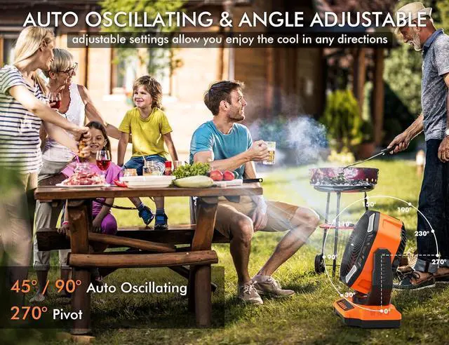Auto Oscillating: This battery powered fan can auto oscillated from 45° to 90° in horizontally and 270° adjustable in vertical, so the angle of this fan is easily to manipulate in any direction, it can cover more area and allowing you and your family to enjoy a comfortable breeze in hot day. With a hidden silicone handle design makes the 7.56 lbs outdoor fan easy to carry. You can also open the front cover of this fan with a screwdriver (not included) to clean the bladesTimer and