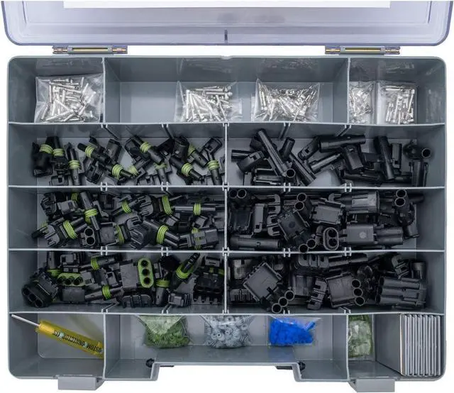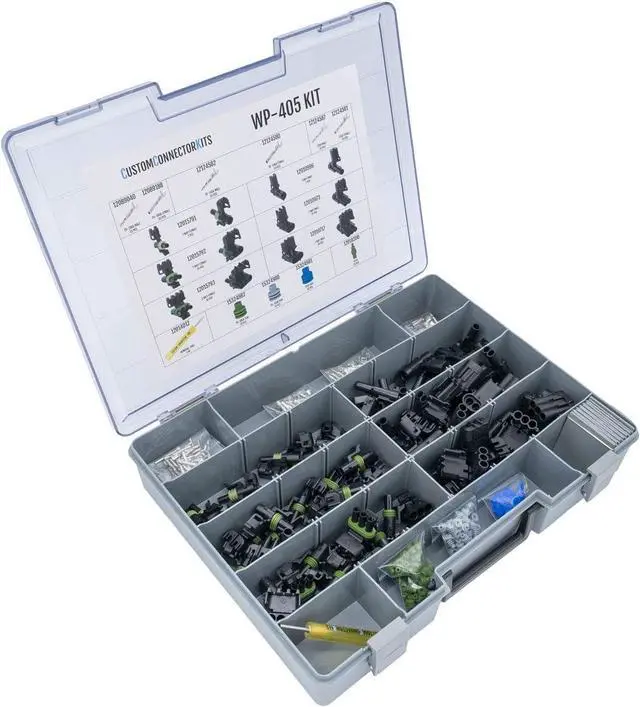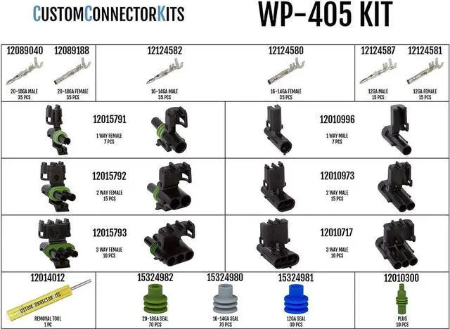 The WP-405 Pro Connector Assembly Kit contains 405 individual Genuine Delphi (Aptiv) parts. The kit includes enough 1-3 way environmentally sealed, easy to use connectors with built-in CPA to build 32 connector assemblies, for a total of 67 individual isolate connections to prevent cross wiring and shorting. It comes with 20-12 AWG crimp terminals rated for 20 Max. Amps, and triple ribbed silicone rubber cable seals. One removal tool comes standard with each kit, fits all terminals included, and our removal tools are manufactured by the same company that manufactures them for Delphi.