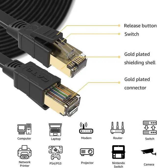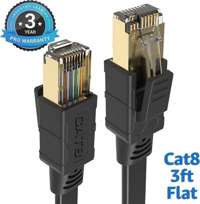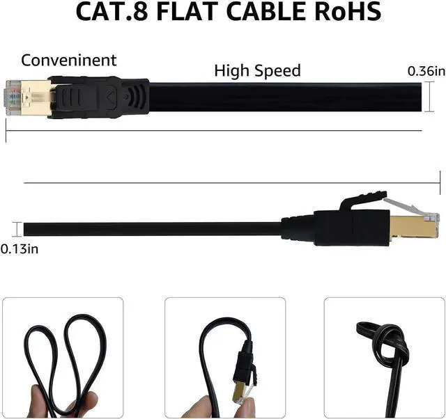 Cat8 Ethernet cable 10 ft with high bandwidth of up to 2000MHz & 40Gbps speed, which achieves much faster data transmission than Cat7/cat6 or cat5e/cat5 for video chatting, online high definition video streaming, download and online gaming. Consist of 2 shielded twisted pairs (STP) of copper wire with gold plated contact pin sin each RJ45 Connector. This provides great resistance to cross talk, noise, and interference Flat design is more flexible than round cable, which can be run under the carpet or bent through corners or into desk