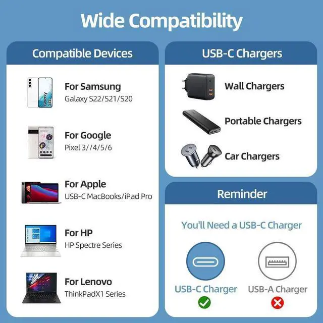 Unrivaled Compatibility: Ultra-wide compatible protocol and can charge almost any Type-C device. Compatible with Galaxy S22/Ultra S22+/Note 20/S21/S20.. Pixel 4/2/3 /3XL/2XL MacBook Pro 2021/2020/2019/2018, Air 2020 etc..